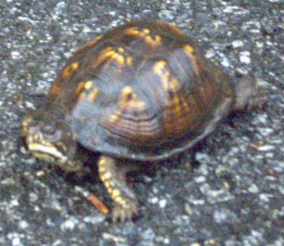 Beyond the driveway is the road and the large parking lot for the boat ramp. Both can be pretty busy at times with people focusing on their own quests, rapidly maneuvering heavy trucks and boat trailers, in their pursuit of happiness. They surely aren't creeping around at 2 miles per hour, avoiding little box turtles.